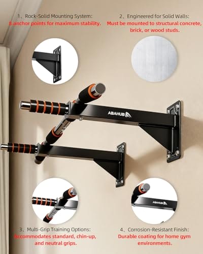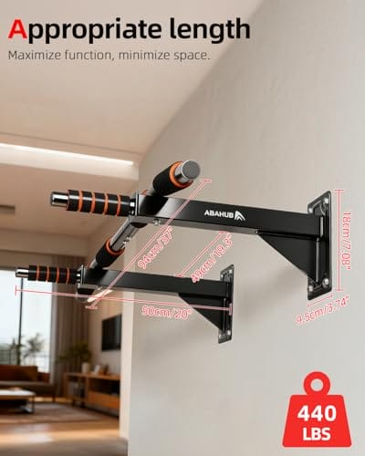 Ihr Heim-Fitnessstudio für Krafttraining: Die an der Wand montierte Abahub Klimmzugstange maximiert Ihre Trainingseffizienz, indem sie wichtige Muskelgruppen – Brust, Schultern, Rücken, Bauchmuskeln und Bizeps – für das Ganzkörper-Krafttraining anspricht. Ideal für Standard- und Neutralgriff-Klimmzüge, Klimmzüge und vielfältige Trainingsroutinen zu Hause. Da es direkt an der Wand montiert wird (nicht in einer Tür), spart es Platz und ist perfekt für Heimfitnessstudios.