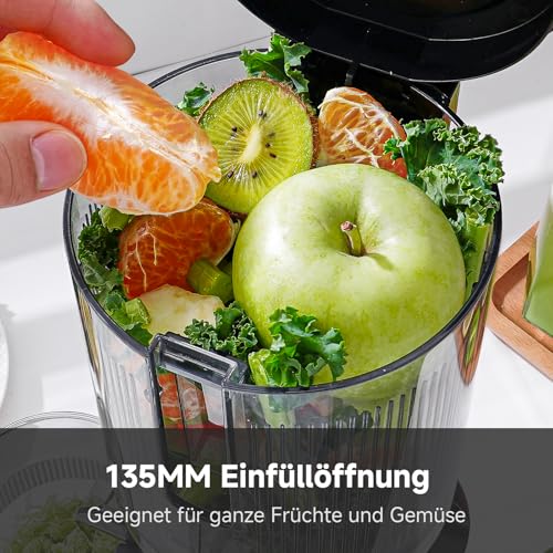 GROSSE ÖFFNUNG UND KAPAZITÄT: Der Entsafter hat eine 135-mm-Öffnung und ein großes Fassungsvermögen, so dass Sie große Portionen Gemüse und Obst auf einmal einfüllen können, ohne das Gemüse und Obst vorher in kleine Stücke schneiden zu müssen, was auch bedeutet, dass Sie nicht die ganze Zeit neben dem entsafter slow juicer stehen und die Zutaten einfüllen müssen, was Ihre Vorbereitungs- und Fütterungszeit erheblich verkürzt