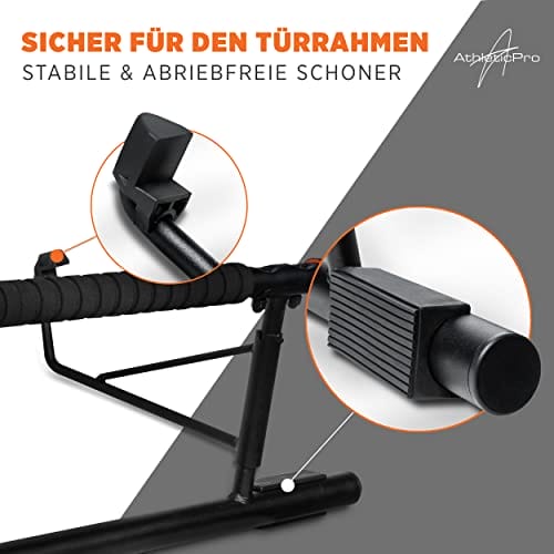 AthleticPro Klimmzugstange für Türrahmen ohne Bohren zum Einhängen – Stabile Pull Up Bar & Türreck [bis 90cm breite Tür] – Für Klimmzüge, Dips & Push-Ups inklusive Klimmzugsband