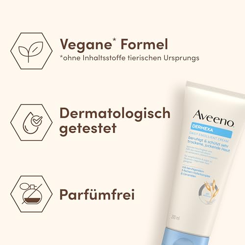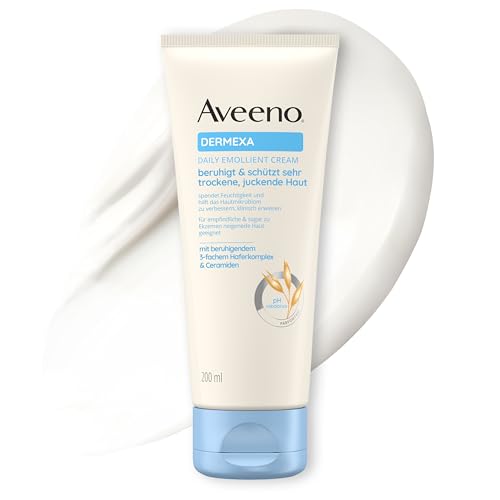 Aveeno Dermexa Feuchtigkeitsspendende Tägliche Emollientien Creme – beruhigt & schützt sehr trockene, juckende Haut. Die Körperlotion spendet Feuchtigkeit und hilft, das Hautmikrobiom zu verbessern, klinisch erwiesen. Die Hautpflege Creme ist für empfindliche und sogar zur Ekzemen neigende Haut (Neurodermitis) geeignet. Sie hilft wissenschaftlich erwiesen, Schübe starker Hauttrockenheit zu verhindern. Die parfümfreie Feuchtigkeitscreme mit 3-fachem Haferkomplex & Ceramiden eignet sich für Babys, Kinder und Erwachsene mit sehr trockener, juckender, zu Ekzemen neigender Haut.