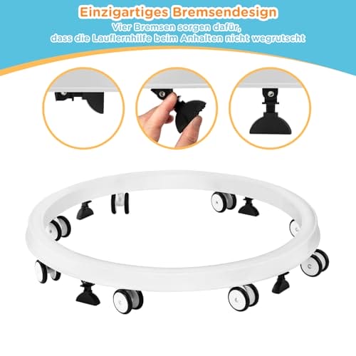 Bremsendesign: Unsere Gehfrei baby ab 6 monate ist mit vier Bremsen ausgestattet, die bei Bedarf betätigt werden können, um den Laufwagen baby in ein festes Aktivitätszentrum zu verwandeln. Wenn Sie einmal keine Zeit haben, auf das Baby aufzupassen, sorgen die Bremsen für zusätzliche Sicherheit