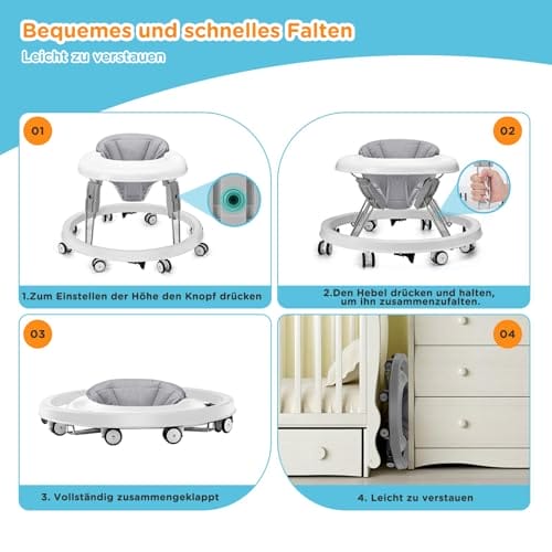 Ein-Knopf-Anpassen-Design: Das patentierte Design des Gehfrei baby ab 8 monate ermöglicht eine neue Möglichkeit zur Höhenverstellung mit einem Ein-Knopf-Anpassen Design. Durch Drücken des Knopfes auf der Laufhilfe für baby mit nur einer Hand kann die Höhe eingestellt werden, was die Bedienung der Höhenverstellung einfacher und bequemer macht