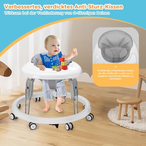 Baby Lauflernhilfe, Anti-Collision Design One-Touch Folding Baby Walker, Anti-Roll 8-Rad-Rundfahrwerk, 7-Gang höhenverstellbar, mit großem Essteller und Bremse von 6-18M (Grau)