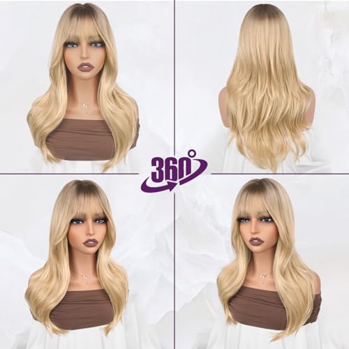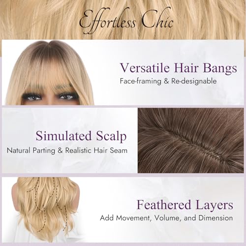 BARSDAR Ombre Blond Perücke mit Pony, 50cm Layered Perücke mit Dunklen Wurzeln für Frauen Natürliches Aussehen Weiche Gewellte Synthetische Sabrina Perücken Glattes Haarschnitt Fringe Tägliche Party