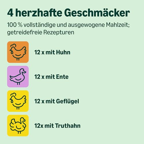 Die Packung enthält 48 Portionen: 12 x gelierte Hühnerhäppchen; 12 x Häppchen mit Ente in Gelee; 12 x Snacks mit Geflügel in geliertem Fleisch; 12 x Snacks mit Truthahn in Gelee