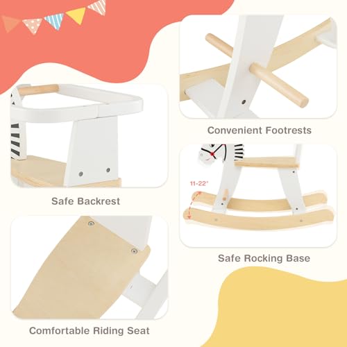 🦓 Bequemer Halt – Die Griffe und die Fußstütze aus hochwertigem Kiefernholz sind nicht nur stabil, sondern auch glatt und splitterfrei. Dies bietet zusammen mit der Rückenlehne optimalen Komfort und Halt für Ihr Kind, während es hin und her schaukelt.