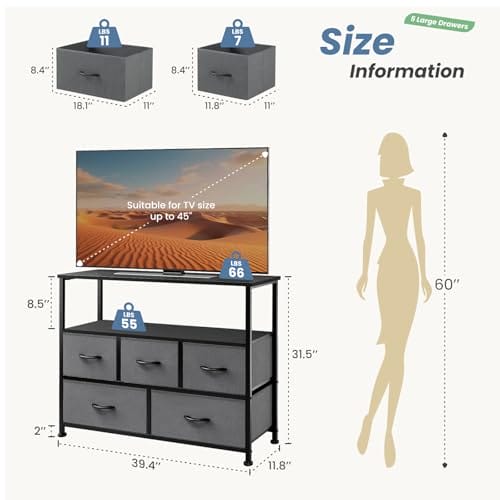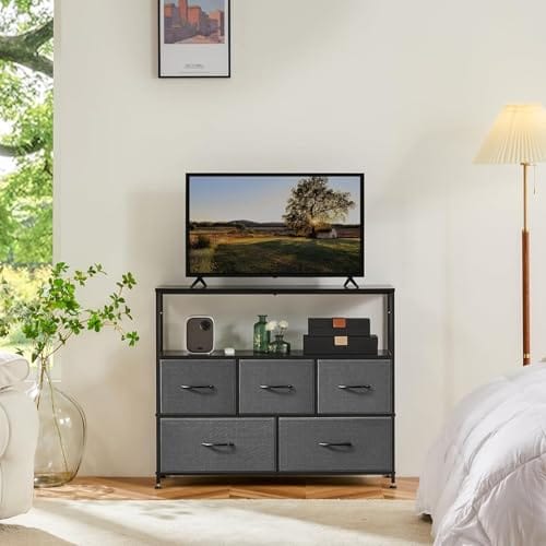 DUMOS Kommode mit Schubladen – kommoden & Sideboards für Schlafzimmer Geeignet, Komodenschrank mit 5 Schubladen, TV-Schrank mit Stabilem Stahlrahmen, Ideal für Schlafzimmer, Wohnzimmer (Grau)