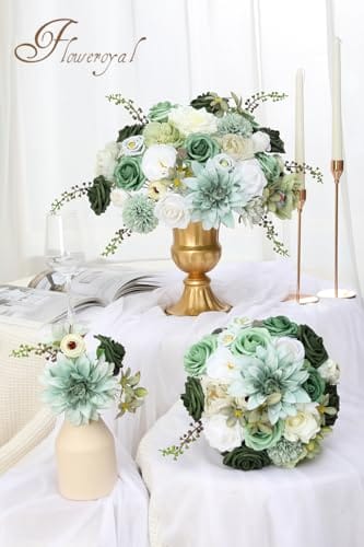 Floweroyal Artificial Flowers Kombination Grüne Blumen Mischen Dahlia Rosen mit Stielen für DIY Hochzeit Brautsträuße, Babyparty, Blumenarrangement, Tischmittelstücke, Heimdekoration