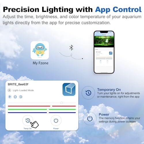 Intelligente APP-Steuerung: Einfach per Bluetooth verbinden, um Helligkeit und Farbe präzise über das Smartphone anzupassen – vollständig an Ihre Bedürfnisse anpassbar. Die Speicherfunktion behält Ihre Einstellungen während eines Stromausfalls bei, während die temporäre Lichtfunktion es ermöglicht, die Aquarium Beleuchtung App für Wartungsarbeiten oder Inspektionen kurzfristig zu aktivieren, ohne Ihre Voreinstellungen zu beeinflussen. So wird eine nahtlose und bequeme Bedienung sichergestellt.