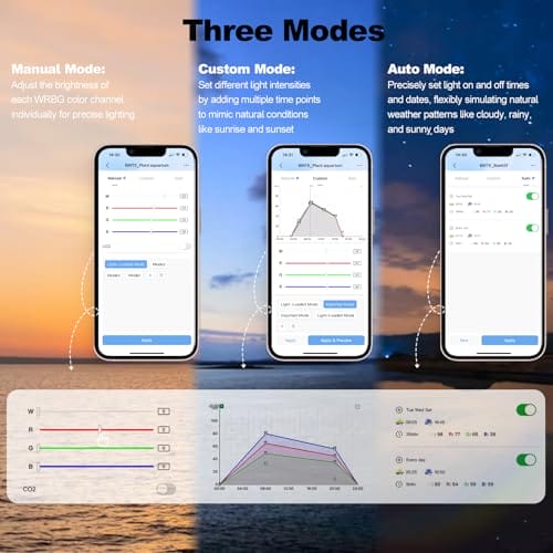 Manuell/Automatisch/Benutzerdefiniert – 3 Modi: Die LED Aquarium Beleuchtung bietet einen Benutzerdefinierten Modus mit bis zu 24 Zeitpunkten für Sonnenaufgangs- und Sonnenuntergangszyklen. Im Automatikmodus simuliert das Licht dynamische Wetterbedingungen wie bewölkte, regnerische oder sonnige Tage und schafft so eine natürliche Umgebung. Der Manuelle Modus ermöglicht präzise Anpassungen von Helligkeit und Farbe, wodurch die Aquarium Beleuchtung LED besonders flexibel wird.