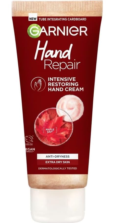 Garnier Hand Repair intensively nourishes and instantly soothes skin to help relieve tightness and discomfort. Developed by Garnier for extra-dry skin this hand moisturiser leaves rough chapped hands looking soft, supple and hydrated for up to 24 hours. Enriched with glycerin and maple sap extract, known for its soothing properties. This high performance formula is dermatologically tested and suitable for all skin types, even sensitive skin. Garnier Hand Repair helps the hydrating needs of extra dry skin. This ultra-restoring hand lotion intensively nourishes the skin with moisture and instantly soothes. Enriched with maple sap extarct, known for its nourishing properties, and glycerin this high performance formula soothes skin from discomfort and tightness and helps to restore suppleness. Is Garnier Hand Repair right for me? Yes, if your skin feels tight, extra-dry and you are looking for an effective solution to intensely moisturise hands so that they feel soft, supple and comfortable again. Suitable for all skin types, even sensitive skin. Dermatologically tested. All Garnier products globally are officially approved by Cruelty Free International under the Leaping Bunny programme, the leading organisation working to end animal testing, and the recognised Cruelty Free Gold Standard. Garnier Hand Repair is for extra dry skin. This ultra-restoring hand lotion intensively nourishes the skin with moisture and instantly soothes. Enriched with maple sap extract, known for its nourishing properties, this high performance formula soothes skin from discomfort and tightness and helps to restore suppleness. Goes well with Garnier Body Repair Body Lotion Dry Skin 400ml; Garnier Summer Body Gradual Tan Moisturiser Dark 400ml; Garnier Intensive 7 Days Shea Butter Probiotic Extract Body Lotion Dry Skin 400ml Nourishing Canadian Maple Sap Preparation and Usage Massage a generous amount into dry hands. Do not apply on face. The product is certified by Cruelty Free International and guarantees that it is not tested on animals.