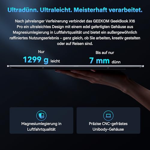 🪶【Ultradünn & Leichtbau – Meisterhaft verarbeitet】 Schon beim ersten Anheben spürt man den Unterschied: Das GEEKOM GeekBook X16 Pro setzt auf ein Gehäuse aus Magnesiumlegierung in Luftfahrtqualität, wiegt nur 1299 g und verjüngt sich auf nur 7 mm. Das präzise CNC-gefräste Unibody-Design wirkt wie aus einem Guss – mit sanft abgerundeten Kanten und exakt gesetzten Fugen. Eine spezielle Mehrschichtbeschichtung verwandelt das Metall in eine warme, griffige Soft-Touch-Oberfläche, die deutlich weniger Fingerabdrücke zeigt. Das Ergebnis ist ein Notebook, das sich so hochwertig anfühlt, wie es aussieht – geschaffen für alle, die viel unterwegs sind und ihrem Arbeitsgerät bedingungslos vertrauen.