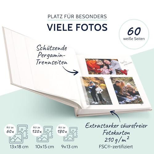 Im Fotoalbum sind 60 weiße Seiten (30 Blatt) für bis zu 180 Fotos im Format 9 x 13 cm und Pergamin Trennseiten enthalten, die ein Vergilben oder Verkleben Ihrer Urlaubsfotos & Erinnerungen verhindern