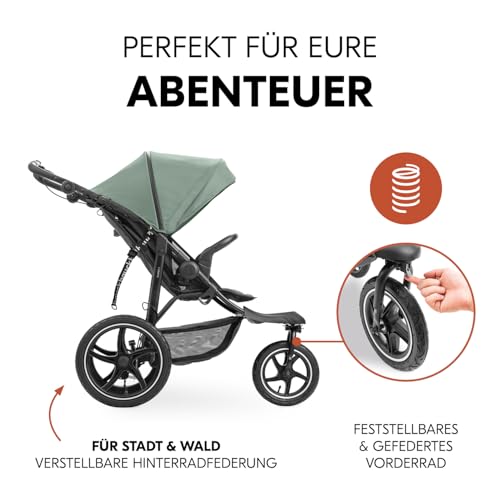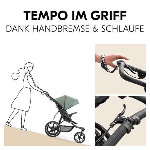 hauck Runner 3, Jungle Green – Dreirad Kinderwagen Buggy mit XL Lufträder, Federung, Handbremse, XL Sonnenverdeck, Netzfenster, Korb mit Deckel, Liegeposition, Getränkehalter, ab Geburt bis 22 kg