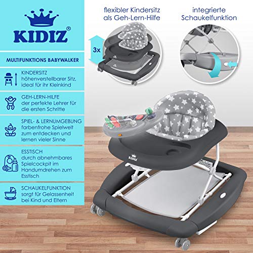 KIDIZ® 4in1 Lauflernhilfe Babywalker Spiel- und Lauflernwagen Gehfrei Schaukelfunktion Babywippe mit Rollen, Licht, Musik,Spielecenter Esstisch Laufstuhl Laufhilfe babys ab 6 Monaten Klappbar Grau