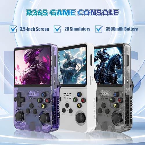 【3,5-Zoll-IPS-OCA-Full-Fit-HD-Bildschirm & Kompaktes Design】Der R36S verfügt über einen 3,5-Zoll-IPS-OCA-Full-Fit-HD-Bildschirm mit einer Auflösung von 640*480, der lebendige Farben und scharfe Bilder für ein immersives Spielerlebnis liefert. Seine kompakte Größe (ähnlich wie ein Smartphone) macht ihn sehr portabel, perfekt für Spiele unterwegs, egal ob Sie reisen, campen oder einfach zu Hause entspannen. Das elegante lila Design verleiht ihm einen stilvollen Touch, was ihn zu einem großartigen Geschenk für Kinder und Erwachsene macht.