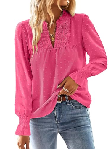 Details: Langarmshirt Damen Herbst Boho Top Oberteile Fließend Elegant V-Ausschnitt T Shirt Süß Lässig Outfits Frühling Winter Longshirt Spitze Kleidung Paspel Volant