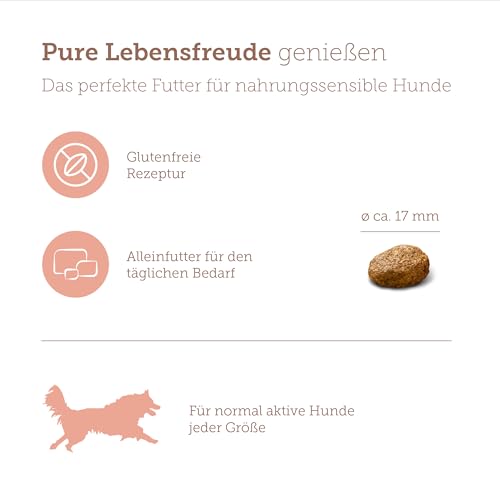 OHNE WEIZEN: Das Trockenfutter pure sensitive ist optimal für sensible Hunde geeignet. Das hochwertige Futter wird auch den individuellen Ansprüchen deines Hundes gerecht