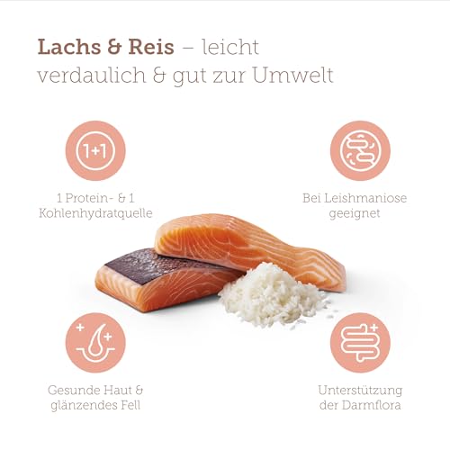 GENAU RICHTIG: Unsere Rezeptur enthält ausschließlich Lachs und Reis. Durch die auf das Wesentliche konzentrierte Zusammensetzung wird das Risiko von Unverträglichkeiten minimiert für das Wohlbefinden deines Lieblings
