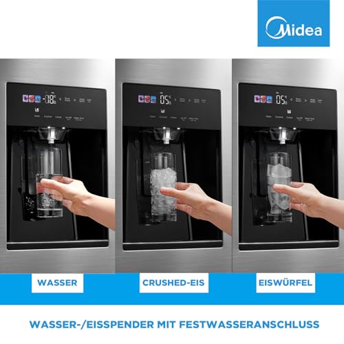 Midea Side by Side Kühlschrank Großraum 569L, 3-in-1 Wasserspender mit Festwasseranschluss, Intelligente Frischehaltung & WiFi, NoFrost, 360° Multi-air Flow, Inverter Kompressor, MDRS761MIE46