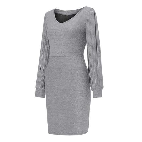 MOKBAY Glitzer Kleid Damen V-Ausschnitt Kurz Sexy Abendkleid Langarm Festlich Pailletten Cocktailkleid Ballkleid Mode Party Kleider