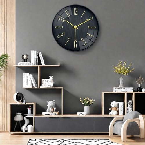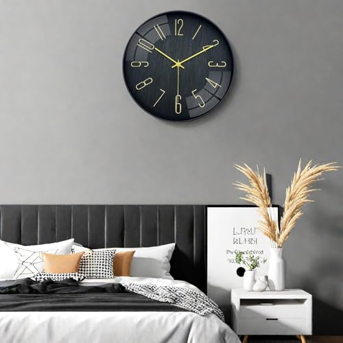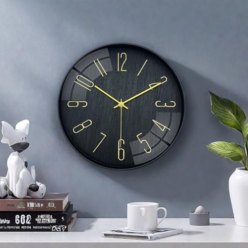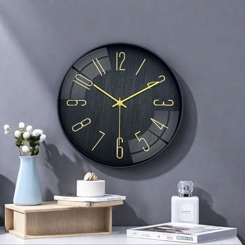 Leicht zu lesen: Diese Wanduhr hat 12 große dreidimensionale goldene Ziffern auf einem schlichten schwarzen Zifferblatt. Die auffälligen Ziffern machen es viel einfacher, die Zeit von überall im Raum abzulesen.