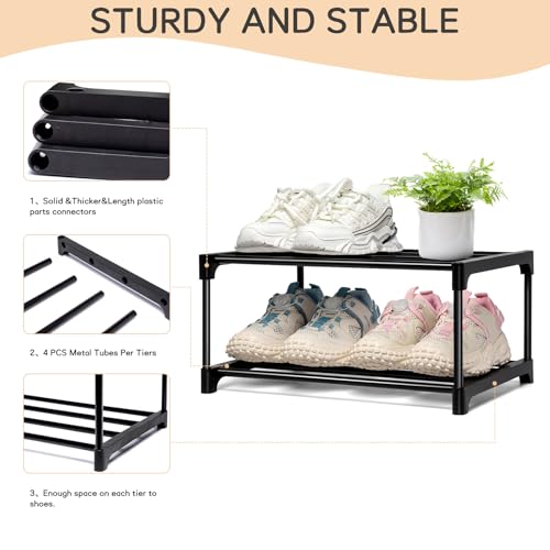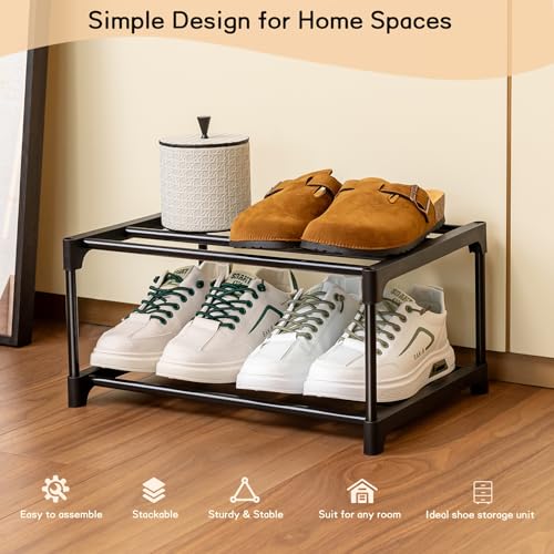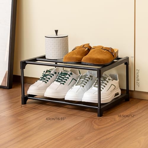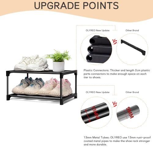 OLYREO Schuhregal mit 2 Ebenen, Schuhregale Schmal Platzsparend aus Metall Schwarz, Stapelbar Dauerhafte Schuhregal Klein Schuhaufbewahrung für 4 Paar Schuhe für Flur, Wohnzimmer, Schlafzimmer