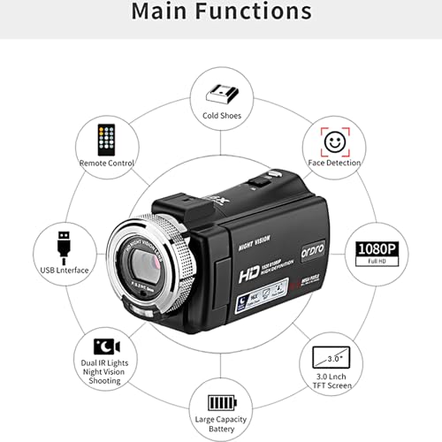 ORDRO V12 Videokamera Camcorder Full HD 1080P 30FPS Infrarot Nachtsichtkamera 3.0 Zoll LCD Bildschirm 16X Zoom Camcorder mit 16GB Memory Karte Fernbedienung und 2 Akkus