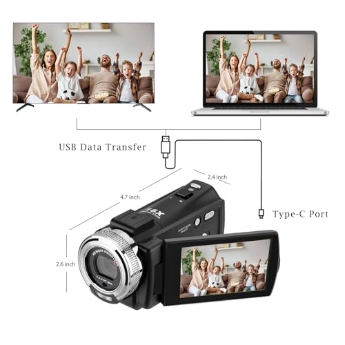 1080P Videokamera: Auflösung 1920x1080P (FHD), bis zu 20,0 Megapixel. 3,0-Zoll-TFT-LCD-Bildschirm (270-Grad-Drehung). 16-facher digitaler Zoom, Gesichtserfassung, Anti-Shake, eingebautes Mikrofon und Lautsprecher, Mini-USB2.0- und AV-Ausgang, Fernbedienung. Wir empfehlen, Videos auf Ihren Fernseher oder Computer hochzuladen, um bessere Bilder und Ton zu zeigen.