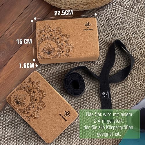 Overmont Yogablöcke Kork 2er Set Yogaklotz – Yoga Block mit Yoga Gurt – Korkblock für Fitness Pilates Stretching und Meditation