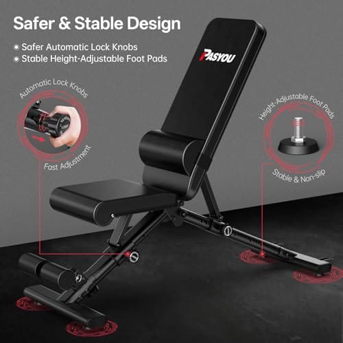 【FREUNDLICHES DESIGN】:Die PASYOU Bank wird mit einer Lendenwirbelstütze geliefert, die ein komfortableres Trainingserlebnis bietet. Mit der automatischen Verriegelung ziehen Sie einfach zuerst den Knopf und drehen ihn dann, um die gewünschte Rückenlehne und Sitzposition schnell einzustellen. Die Anti-Rutsch-Pads können mit nur einer Drehung in der Höhe verstellt werden, keine Sorge um Stabilität und Sicherheit.