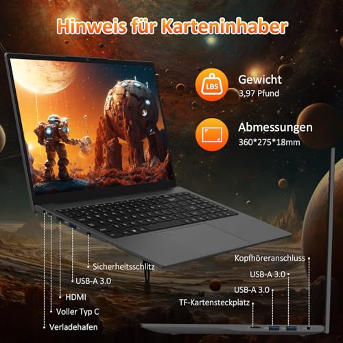 🌟Multifunktionale Anschlüsse:Dieses Notebook ist mit einer Reihe von Anschlüssen ausgestattet, um unterschiedlichen Nutzungsszenarien gerecht zu werden. Es enthält: Ladeanschluss: DC3,5 mm 12 V/3 A, USB-Anschluss: USB × 3, Kopfhöreranschluss: 3,5 mm × 1, Mini-HDMI × 1, Micro SD × 1, Type C × 1. Bei Fragen zu unserem Produkt oder zur Unterstützung können Sie uns jederzeit kontaktieren. Unser Kundenservice-Team steht Ihnen gerne zur Verfügung, um Ihnen bei allen Anliegen weiterzuhelfen und sicherzustellen, dass Sie mit Ihrem Einkauf rundum zufrieden sind.