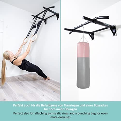 ✅ MULTIFUNKTIONAL: Die Klimmzugstange ist extrem vielseitig und kann als Klimmzugstange oder dank der Öse als Boxsackhalterung und Aufnahme für Turnringe oder Schlingentrainer verwendet werden. So macht sie dein Zuhause zum Profi Fitnessstudio. Trainiere zahlreiche Übungen wie Klimmzüge, Chin-ups, Beinheben und viele weitere und trainiere deine komplette Arm-, Schulter-, Bauch- und Rückenmuskulatur.