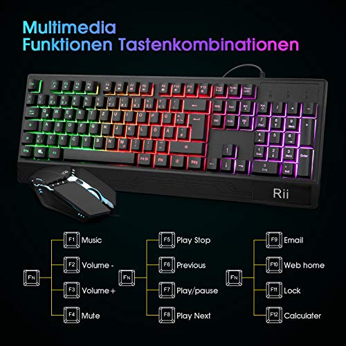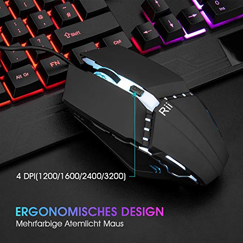Rii Gaming Tastatur und Maus Set, Maus und Tastatur, RGB Hintergrundbeleuchtung QWERTZ (DE-Layout), Regenbogen Farben Beleuchtete USB Wasserdicht Tastatur und Maus mit 3200 für Pro PC Gamer
