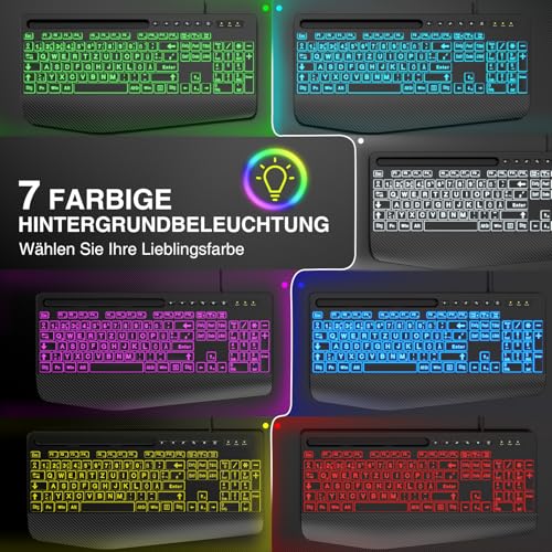 SABLUTE Tastatur Beleuchtete Kabel USB PC Ergonomische Tastaturen Hintergrundbeleuchtete Computertastatur mit großem Druck, 7-Farbiger Hintergrundbeleuchtung,Telefonhalter, gut lesbar