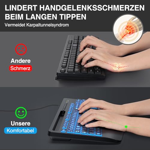 【Ermüdungslinderung Am Handgelenk】 Entworfen mit einer Handballenauflage und einer unteren Unterstützung. Das ergonomische Tastaturlayout reduziert die Ermüdung des Handgelenks und Beschwerden bei längerem Gebrauch
