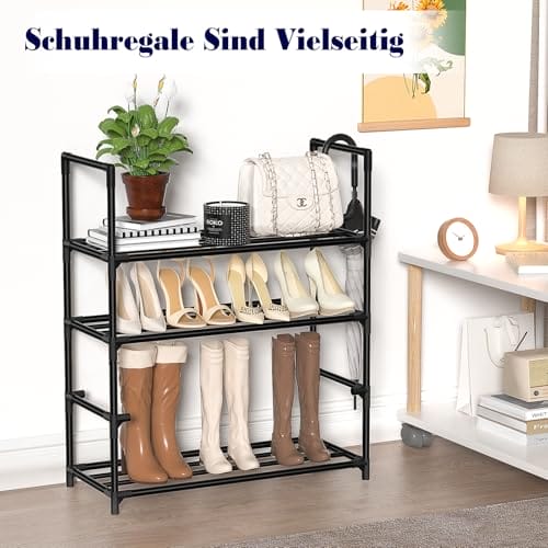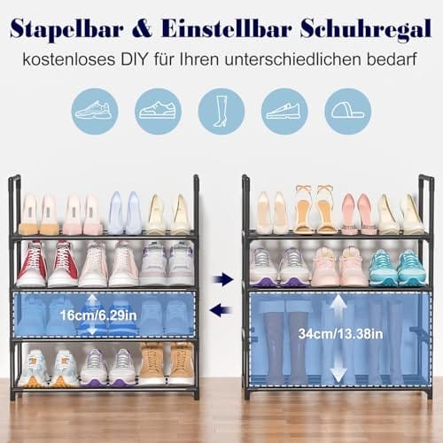 4 ETAGEN-SCHUHREGAL MIT GROSSER KAPAZITÄT: Dieses Schuhregal schwarz verfügt über 4 Etagen mit den Maßen 60 x 25 x 72 cm zur Aufbewahrung aller Arten von Schuhen, einschließlich Sportschuhe, flache Schuhe, Sandalen und mehr. Die stapelbaren und herausnehmbaren schuhregal schmal sorgen dafür, dass auch Ihre Stiefel ordentlich aufbewahrt werden können. Dieses schuhregal platzsparend bietet Speicherlösung.