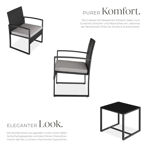 JEDERZEIT GRIFFBEREIT: Auf der robusten Sicherheitsglasplatte in schickem Schwarz sind leckerer Kaffee, schmackhafte Snacks und spannende Lektüre immer in Reichweite. Ein idealer Beistelltisch für gemütliche Stunden im Freien, wenn Du platzsparende Möbel suchst oder der Platz auf dem Balkon für einen Esstisch nicht ausreicht. So musst du weder auf Stil noch auf Funktionalität verzichten. Das Set aus 2x Armlehnstuhl und Gartentisch wetterfest bietet beides!