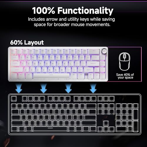 【Drehknopf & Kompaktes 60%-Design】Steuern Sie Lautstärke oder Medienwiedergabe bequem mit dem integrierten Drehregler. Das platzsparende 60%-Layout (66 Tasten) schafft mehr Raum auf Ihrem Schreibtisch, während alle wichtigen Funktionen über Tastenkombinationen weiterhin verfügbar bleiben.
