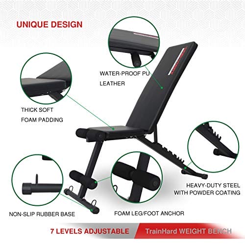 TrainHard Verstellbare Klappbare Hantelbank, Multifunktion Trainingsbank – Schrägbank – Bauchtrainer – Flachbank – Gerade/Schräg/Negativ- Geeignet für Einsteiger für Zuhause bis 200 kg Belastbar