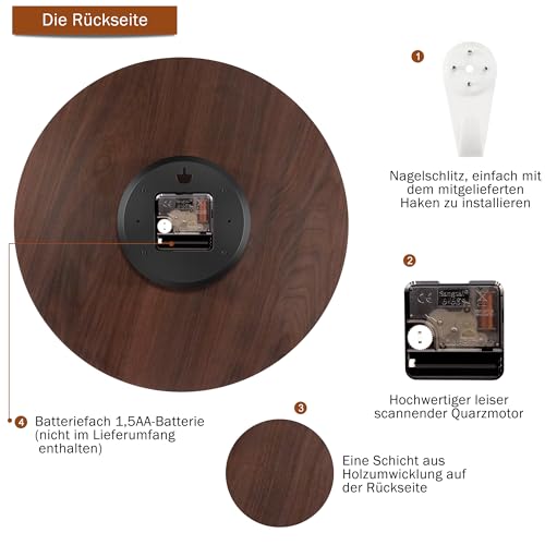 🕘 【Einfache Installation】:Dank des rückseitigen Schlitzdesigns lässt sich die Uhr schnell und unkompliziert mit dem mitgelieferten Haken aufhängen. Betrieben durch 1 AA-Batterie (nicht im Lieferumfang enthalten), ist die Uhr innerhalb von Minuten betriebsbereit – eine praktische Ergänzung für Ihren Raum.