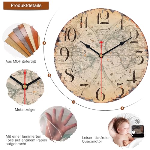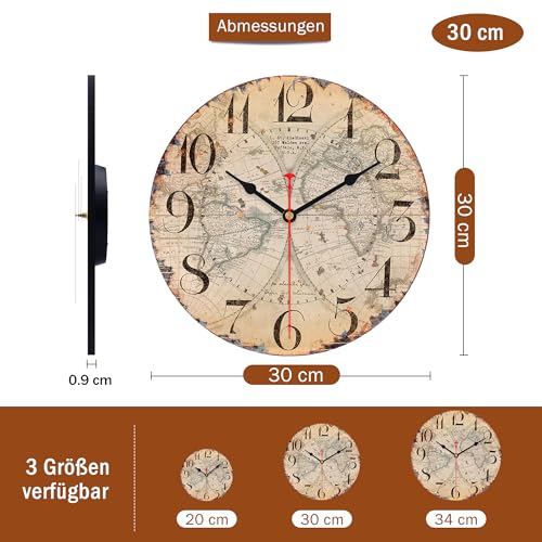 🕘 【Vintage Stil】: Die 30 CM Wanduhr verfügt über ein klassisches Karte-Thema, aus hochwertigem MDF-Faserplatte gefertigt. Es verleiht einem einzigartigen Charme der Dekoration von Wohnräumen wie Wohnzimmern, Küchen und zeigt eine diskrete Eleganz.