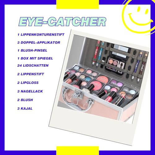 UNSERE HIGHLIGHTS FÜR DICH: Unser umfangreich befüllter Kosmetik-Koffer enthält Lidschatten, Lippenstifte, Lipgloss, Nagellack, Rouge, Kajal, Lippenkonturenstift, Doppel-Applikatoren, Rouge Pinsel und eine Box mit Spiegel für Unterwegs
