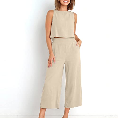 Zweiteiler Sommer Damen 2026 Elegant Hosenanzug Ärmello Crop Tank Top und Caprihose Sommer Outfit Set Modische Einfarbig Freizeitanzug Baumwolle Loungewear mit Taschen Weite Bein Hosenanzüge